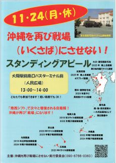 大阪駅前南口バスターミナル前(人民広場) 13:00-14:00 <チラシ(PDF)> あれから2年。2022年12月に閣議決定された安保3文書に基づいて日米一体での対中戦争準備がフィリピン、オーストラリア、韓国を巻き込んで凄まじい勢いで進んでいます。12式地対艦ミサイル能力向上型と呼ばれる中国本土を攻撃できる射程1000kmの地上発射型長射程ミサイルの今年度中の陸上自衛隊健軍駐屯地(熊本)への配備を皮切りに、海上自衛隊のイージス艦への米国製巡航ミサイルトマホークの配備(射程1600km)が始まろうとしています。関西でも祝園駐屯地で長射程ミサイルを保管するための大型弾薬の建設着工が強行されました。 高市自民維新連立政権のもとで軍事費のGDP2%の達成の前倒しや安保3文書の改定など戦争国家化の動きが一層強められようとしています。 沖縄が呼び掛けた運動は、九州から西日本に広がり今年2月に鹿児島で知り・つながり・止めるを合言葉に「戦争止めよう!沖縄・西日本ネットワーク」が、結成され、6月には東京で統一した対政府交渉や相次ぐ軍事演習に抗議する行動が西日本各地で行われてきました。関西でも10月19日京都精華町のけいはんな公園に関西と全国から総勢2700人の人々が結集して、弾薬庫建設反対に抗議の声を上げました。 私たちは、高市自民維新連立政権の下で進む戦争国家化に反対し、沖縄・西日本と全国の運動と連帯して「沖縄を再び戦場にさせない」「軍事費削減。武器よりごはん」「中国との戦争ではなく日中友好を」掲げて11月24日、大阪駅前でスタンディングアピール行動を行います。是非参加ください。 2025年11月5日 |