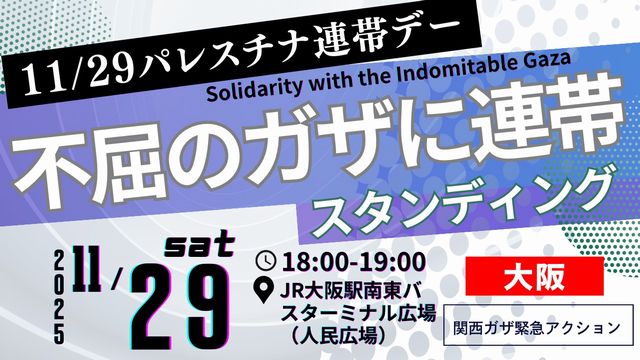2025年 11月24日(月・休) 沖縄を再び戦場(いくさば)にさせないスタンディング行動 日時 11月24日(月・休) 13:00―14:00 場所 大阪駅前南口バスターミナル前(人民広場) 呼びかけ 沖縄を再び戦場にさせない実行委員会 11月29日(土) 敗戦80年−武器よりゴハン 対中国戦争の準備をやめろ!日中友好を! リブ・イン・ピース 連続カフェ第3回 「福島イノベーション・コースト構想とは 福島復興の名の下に進む原子力推進と軍事ビジネス」 日時 11月29日(土) 2時〜5時 場所 エルおおさか南館101号室 (地下鉄・京阪天満橋駅から西へ300m) <地図> 参加費200円 ZOOM講演:和田央子さん(福島イノベーション・コースト構想を監視する会) 「福島イノベーション・コースト構想」とは、2011年の大震災・原発事故によって放射能汚染の被害を受け、居住が困難となり、あらゆる産業が破壊された福島県浜通り地域の「復興」を名目とする国家プロジェクトです。 しかし、その実態は、従来の住民の生活再建や地域再生ではなく、対中戦争準備を進める勢力による軍事研究拠点の整備という側面が強くあります。つまり、福島「復興」の名の下に予算を獲得しながら、実際には軍事目的への転用が進められているという構造が明らかになっています。 そして、さらに問題なのは、こうした実態が国民に広く知られていないということです。今回、福島イノベーション・コースト構想を監視する会の和田央子さんに講演をお願いしました。「福島イノベーション・コースト構想」の実態をしっかり理解しましょう。 11月29日(土) 不屈のガザに連帯! パレスチナ連帯デー スタンディング 日時 11月29日(土) 18:00〜19:00場所 JR大阪駅南東側バスターミナル広場(人民広場) 主催:関西ガザ緊急アクション 12月1日(月) パレスチナ連帯、ガザ侵攻やめよ、停戦せよ スタンディングとビラまき(中百舌鳥駅) 日時 12月1日(月) 18:00〜19:00場所 南海中百舌鳥駅北側広場 呼びかけ 堺市民有志 |