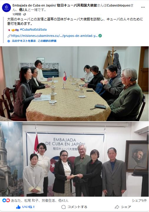 2月26日にキューバの会、ブエノス・アミーゴスの皆さんと東京のキューバ大使館を訪問し、大使をはじめ大使館の皆さんから歓待を受けました。ジセラ・ガルシア大使から、トランプ大統領の石油封鎖のせいで極めて厳しい状況に追いやられているキューバの現状と人々の不屈の闘いについてお話を伺いました。私たちはキューバ支援カンパ活動を始めま他ばかりですが、最初の集約分をお渡ししました。なお、訪問の様子は次の日にキューバ大使館のfacebookやXで紹介していただきました。 以下に大使から伺った今日のキューバの現状を簡単に紹介します。 ジセラ・ガルシア大使のお話今年の諸々の混乱は1月3日に始まりました。その時からキューバへのベネズエラ産原油の供給がストップしています。1月29日にトランプ大統領が大統領令によってキューバに石油を供給する国に高関税を課すという発言をしました。キューバは原油を輸入することなしに国としては立ち行きません。国内産の原油ではとても国内の需要を満たすことができないからです。さらに、キューバ産の原油は重質油で、硫黄が多く含まれているのでなかなか使用が難しいのですが、なんとかうまく精製して用途を拡大できるように努めています。 国内の発電の需要を満たすために昨年から太陽光パネルの導入(主に中国から)を始めているところです。電気をできるだけエッセンシャルワーカーの方に、病院や学校、高齢者施設などに優先的に供給しています。太陽光パネルの設置を国を挙げて行っています。国営企業、民営企業を問わず、太陽光パネルを導入したところには税制上の優遇措置を与えています。 医療現場などでは電力不足が深刻な影響を与えています。がん患者さんや透析を必要とする患者さんは診療所では必要なケアが受けられなくなっているので、総合病院に入院してもらって、そこでケアを受けられるよう対策をとっています。物資輸送の鉄道便も本数を減らして各県の県都間の便に限定する等の調整をしています。 教育現場へも影響は及んでいます。たとえば幼稚園、保育園、小学校などでは朝の時間、開園時間を早めて電気の影響が及ばないようにしています。就学前教育、小学校の教育では対面式の教育が必要になるので、対面式の教育を維持しています。大学を含む中等・高等教育では、オンライン形式での授業を拡大などいくつかの形態をとっています。午前の部、午後の部と2部制だったものをどちらかに集約したり、大学の医学部などで大規模に全国的に授業を展開していたところも、各県に分散して首都に行かなくても学生達が授業を一部受けられるようにしています。そういった工夫を進めているところです。 医療や教育の分野での対策をお話ししましたが、国防に関しては全くこれまでと変わりなく訓練をしています。今はアメリカは軍事侵攻はしないと入っていますが、それをそのまま鵜呑みにすることなどできません。やはり準備を怠らないことが大事です。 観光については、いくつかのホテルを閉鎖し、観光客を発電設備のあるホテルに集約して最低限のサービスを保証しています。 いくつか紹介しましたが、コロナの経験もありますし、キューバが社会主義の国だというのもあるけれど、キューバは恒に準備ができている、そういった国の一つではないかと思います。 まあ、そうは申しましても物資の窮乏はいかんともしがたいところがあります。毎日の停電や医薬品不足は、以前からキューバ経済が疲弊していたところはありますが、今回のもろもろの事態で一層悪化して、非常に厳しいというのがあります。 そういった事態を受けて、日本の連帯運動のみなさまから声明も発表していただき、カンパもいただいています。一つ問題になるのが、お寄せいただいたカンパをキューバに銀行送金できないということです。これまでにいただいたカンパは医薬品ですとか医療物資を購入して、現物をキューバに送るということをさせていただきました。米国が押し付けている制裁のせいで、銀行送金はもちろん、医療品などに変えてもいろいろと制約が出てきて工夫しなければなりません。 そういったことをいろいろ含めて、それでも日本の友人の皆さんがそれぞれ支援の志を寄せてくださっていることに感謝しています。もちろん皆さんが資産家というわけではないので一人一人が可能な範囲で持ち寄ってくださる気持ちを私たちは嬉しく思っています。(以上、分析はリブインピース) 大使からお話を伺って、ますますキューバ緊急カンパの必要性を感じています。カンパの詳細については「緊急カンパのお願い」のページをごらんください。 2026年2月28日 |