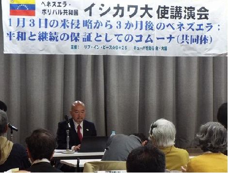 2026年4月4日、大阪市内でベネズエラ・ボリバル共和国イシカワ大使の講演会をリブ・イン・ピース9+25とキューバを知る会・大阪の共催で行いました。約120人が参加し会場は満杯となりました。講演は「1月3日の米侵略から3ヶ月後のベネズエラ:平和と継続の保証としてのコムーナ(共同体)」のテーマで開催され、米国の介入と暴挙に抗して、力強く前進するベネズエラの現状とそれを支えるコムーナの力を実感させるものとなりました。大統領夫妻の拉致・連行は明確な国際法違反 イシカワ大使は講演の冒頭で、リブインピースが1月4日に呼びかけた抗議行動について、「1月3日の事件が起こって、世界で最初にベネズエラに向けて団結の活動をしてくれたのは皆様ではないか」と述べ、主催者であるリブ・イン・ピース9+25およびキューバを知る会・大阪の連帯活動への深い感謝を述べ、この連帯がベネズエラ国民にとって大きな希望であることを強調しました。 イシカワ大使は、1月3日の侵略と大統領夫妻の拉致連行について、他国を侵略し現職大統領を軍事力で連れ去る行為は、国連憲章第2条1項、4項にも違反する暴挙だと厳しく糾弾しました。米国がマドゥーロ大統領に科した「麻薬テロ」という罪はすでに破綻しています。トランプ大統領は議会で「もし他国が米に対して同じことをし大統領を拉致連行しても許されると考えるのか」と質問され、トランプ大統領は答えることはできませんでした。1月5日の最初の法廷で、マドゥーロ大統領は全く正当に「自分はベネズエラの大統領であり、罪は否認する。そして、軍事介入によって誘拐された戦争捕虜であり、ジュネーブ条約で守られるべき身分である」と訴えました。 石油略奪と厳しい制裁のもとで経済成長を実現 大使は、この軍事介入の目的は人権や民主主義ではなく石油の略奪であると断言し、10年以上にわたる制裁の厳しさを説明しました。2015年から外貨収入は400億ドルから100分の1まで激減しGDPも低下、深刻な低栄養や死亡率の増加といった人道的被害が生じました。現在もベネズエラには1,000以上の不法な制裁が科されており、これはまさに「経済戦争」だと指摘しました。しかし制裁と侵略という危機的な状況下で、ベネズエラは2025年まで15四半期連続(約4年)で経済成長を遂げています。画期となったのは、2020年9月の炭化水素基本法で、ベネズエラに投資する石油会社を優遇するという内容が含まれています。ベネズエラが米の経済制裁のもとで高い経済成長を回復したことは、米にとって「悪い見本」となってしまっています。大使は、1918年社会主義ソ連が生き残るためドイツと妥協したブレスト・リトフスク条約を引き合いに出し、犠牲を払って一時的に撤退する時期に来ていると語りました。 コムーナの力と女性のリーダーシップ 制裁下で経済成長を実現できた秘密は、全国に広がるコムーナにあると、大使は力強く語りました。それは資本主義や介入に抵抗する新しい社会モデルであり、想像を超えたユニークなものです。住民が自ら経済、治安、日常生活の意思決定を行い、電気、ガスなど公共サービスも共同で管理しています。全国に数千あるこうした単位が、ボリバル革命の正当性を支えています。2026年3月8日(国際女性デー)に行われた国民投票には、420万人以上が参加しました。国民投票はお祭り騒ぎです。国民投票は、プロジェクトを選ぶ選挙で、保健、教育、食糧、安全、公共サービスなどの分野で選ばれた事業に予算がつけられます。特筆すべきは、コムーナのリーダーの約80%が女性であることです。彼女たちが革命の重要な基盤となり、地域の問題を主体的に解決しています。 ![]() 大使は、「現在のベネズエラは世界の未来が映し出された鏡だ」と述べ、一枚の写真を示しました。ロドリゲス大統領代行が「コムーナ」の人々に囲まれ、みんな幸せそうにしています。自分たちの事業が国によって守られていると感じているのです。大使は、一国の大統領が拉致連行され他国で裁かれることが許されるならば誰も安全ではない、しかし「コムーナ」に目を向けると別の選択肢があることがわかります、と語りました。 大使は以下のように呼びかけました。「皆さんに団結を呼びかけたい。それは、マドゥーロ大統領夫妻に限らず、自らの運命を決めるのはニューヨークの裁判所ではなく自分たちの地域の集会だと決意した国民に対しての団結だ」。最後に、WBCのベネズエラチームへの応援への感謝で締めくくりました。 質疑応答 講演後、以下の興味深い質疑応答がありました。 Q1:コムーナのリーダーはどう選ばれ、富裕層は参加しているのか? A1:富裕層は参加していない。コムーナは低所得者層が直面する社会的問題を解決するための組織だからだ。女性が多いのは、家庭だけでなくコミュニティ内で深い信頼関係を築いているからだ。 Q2:食料自給率と土地の制度について。 A2:かつては石油収入に頼って食料の85%を輸入に頼っていたが、