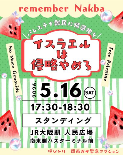 2026年 5月2日(土)~4日(月) 「アジアから問われる日本の戦争」展2026 日時 5月2日 10時半~18時 3日 10時~17時 4日 10時半~16時 場所 大阪市立阿倍野市民学習センター(JR天王寺駅より10分 地下鉄阿倍野駅下車すぐ) <地図> [紹介] 5月3日(日) 輝け憲法! おおさか総がかり集会 日時 5月3日(日) 13:40~ 場所 扇町公園 5月7日(木) パレスチナ連帯、ガザ侵攻やめよ、停戦せよ スタンディングとビラまき(中百舌鳥駅) 日時 5月7日(木) 18:00~19:00場所 南海中百舌鳥駅北側広場 呼びかけ 堺市民有志 5月16日(土) 「ナクバの日」の連帯行動 日時 5月16日(土) 17:30~18:30場所 大阪駅バスターミナル 主催 関西ガザ緊急アクション |