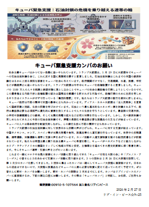社会主義キューバはかつてない危機に追いやられています。トランプ大統領は、1月29日に大統領令でキューバへの石油全面封鎖を命じ、これに反する国に高関税を課すと宣言しました。石油全面封鎖はこれまでの米国の経済封鎖をはるかに上回る深刻な被害をキューバ社会に与えています。政府機関だけでなく、交通機関、水道、医療、学校などが機能停止に追いやられています。トランプ大統領は今年中にキューバを政権転覆すると宣言しました。キューバの1100万人の人々を飢餓と絶望状態に落とし込むことでキューバの社会主義政権を打倒しようとしているのです。この露骨極まる内政干渉と政権転覆の試みは国際法を蹂躙する許されざる行為です。政権打倒のために住民を苦しめるやり方はイスラエルがガザで行っている「集団的懲罰」です。私たちはトランプ大統領の蛮行を絶対に許しません。 キューバ政府は不屈の精神で米国の暴挙に立ち向かっています。ディアス・カネル大統領は「全人民戦争」を宣言して国家防衛と団結、生活の防衛を呼びかけています。石油という最も基本的なエネルギー源を封鎖される下で、政府は最低限必要な必須部門に優先的に資源を投入することで人々の生活を守ろうとしています。最低限の交通手段、小学校や医療機関などの維持、そして太陽光発電の拡大など必死の対策を行なっています。しかし、元々経済封鎖で苦しめられてきた上に今回の石油全面封鎖です。停電の長期化や最低限必要な医薬品の欠乏などが始まっています。キューバの人々は革命政府を断固支持しながら、この窮乏生活に不屈の精神で立ち向かっています。 トランプ大統領の石油全面封鎖に対して世界中から非難の声が上げられ、キューバに対する支援が始まっています。中国やメキシコ、ロシア、スペイン等が太陽光発電や食料、医薬品等の人道支援を行なっています。世界中の反戦運動、連帯運動、労働運動も連帯と支援の声をあげています。カンパ活動や人道支援物資を届ける船団派遣などが計画されています。 私たちは帝国主義と闘う社会主義キューバに希望を感じ、キューバがベネズエラなどと協力しながらカリブ・ラテンアメリカの諸国をリードして地域の平和と安定、主権確立を進めてきた歴史的貢献に深く敬意を表します。今こそキューバ連帯・支援の声を上げたいと思います。これまで一緒にコロナや台風の被害にカンパ活動に取り組んできた「キューバを知る大阪の会」や「ブエノス・アミ―ゴス」の皆さんと力を合わせて支援カンパ活動に取り組みます。3つの団体は2月26日に大使館を訪問して、第1次分のカンパを渡してきました。3団体に集まったカンパは一緒にしてキューバ大使館に直接届けます。日本からの送金はできないので、大使館に医薬品などキューバの人達に必要な物資に変えて送っていただく予定です。 ぜひ皆さんに寄付・カンパをお願いします。寄付・カンパの期限は3月末までにします。カンパはリブインピースのメンバーに直接届けるか、下記の振込口座にお願いします。その際は「キューバカンパ」と明記し、お名前、ご住所もお願いします。 郵便振替:00910−5−107564 加入者名:リブインピース 2026年2月27日 |