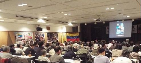 2026年4月4日、大阪市内でベネズエラ・ボリバル共和国イシカワ大使の講演会をリブ・イン・ピース9+25とキューバを知る会・大阪の共催で行いました。約120人が参加し会場は満杯となりました。講演は「1月3日の米侵略から3ヶ月後のベネズエラ:平和と継続の保証としてのコムーナ(共同体)」のテーマで開催され、米国の介入と暴挙に抗して、力強く前進するベネズエラの現状とそれを支えるコムーナの力を実感させるものとなりました。大統領夫妻の拉致・連行は明確な国際法違反 イシカワ大使は講演の冒頭で、リブインピースが1月4日に呼びかけた抗議行動について、「1月3日の事件が起こって、世界で最初にベネズエラに向けて団結の活動をしてくれたのは皆様ではないか」と述べ、主催者であるリブ・イン・ピース9+25およびキューバを知る会・大阪の連帯活動への深い感謝を述べ、この連帯がベネズエラ国民にとって大きな希望であることを強調しました。 イシカワ大使は、1月3日の侵略と大統領夫妻の拉致連行について、他国を侵略し現職大統領を軍事力で連れ去る行為は、国連憲章第2条1項、4項にも違反する暴挙だと厳しく糾弾しました。米国がマドゥーロ大統領に科した「麻薬テロ」という罪はすでに破綻しています。トランプ大統領は議会で「もし他国が米に対して同じことをし大統領を拉致連行しても許されると考えるのか」と質問され、トランプ大統領は答えることはできませんでした。1月5日の最初の法廷で、マドゥーロ大統領は全く正当に「自分はベネズエラの大統領であり、罪は否認する。そして、軍事介入によって誘拐された戦争捕虜であり、ジュネーブ条約で守られるべき身分である」と訴えました。 石油略奪と厳しい制裁のもとで経済成長を実現 大使は、この軍事介入の目的は人権や民主主義ではなく石油の略奪であると断言し、10年以上にわたる制裁の厳しさを説明しました。2015年から外貨収入は400億ドルから100分の1まで激減しGDPも低下、深刻な低栄養や死亡率の増加といった人道的被害が生じました。現在もベネズエラには1,000以上の不法な制裁が科されており、これはまさに「経済戦争」だと指摘しました。しかし制裁と侵略という危機的な状況下で、ベネズエラは2025年まで15四半期連続(約4年)で経済成長を遂げています。画期となったのは、2020年9月の炭化水素基本法で、ベネズエラに投資する石油会社を優遇するという内容が含まれています。ベネズエラが米の経済制裁のもとで高い経済成長を回復したことは、米にとって「悪い見本」となってしまっています。大使は、1918年社会主義ソ連が生き残るためドイツと妥協したブレスト・リトフスク条約を引き合いに出し、犠牲を払って一時的に撤退する時期に来ていると語りました。 コムーナの力と女性のリーダーシップ 制裁下で経済成長を実現できた秘密は、全国に広がるコムーナにあると、大使は力強く語りました。それは資本主義や介入に抵抗する新しい社会モデルであり、想像を超えたユニークなものです。住民が自ら経済、治安、日常生活の意思決定を行い、電気、ガスなど公共サービスも共同で管理しています。全国に数千あるこうした単位が、ボリバル革命の正当性を支えています。2026年3月8日(国際女性デー)に行われた国民投票には、420万人以上が参加しました。国民投票はお祭り騒ぎです。国民投票は、プロジェクトを選ぶ選挙で、保健、教育、食糧、安全、公共サービスなどの分野で選ばれた事業に予算がつけられます。特筆すべきは、コムーナのリーダーの約80%が女性であることです。彼女たちが革命の重要な基盤となり、地域の問題を主体的に解決しています。 ![]() 大使は、「現在のベネズエラは世界の未来が映し出された鏡だ」と述べ、一枚の写真を示しました。ロドリゲス大統領代行が「コムーナ」の人々に囲まれ、みんな幸せそうにしています。自分たちの事業が国によって守られていると感じているのです。大使は、一国の大統領が拉致連行され他国で裁かれることが許されるならば誰も安全ではない、しかし「コムーナ」に目を向けると別の選択肢があることがわかります、と語りました。 大使は以下のように呼びかけました。「皆さんに団結を呼びかけたい。それは、マドゥーロ大統領夫妻に限らず、自らの運命を決めるのはニューヨークの裁判所ではなく自分たちの地域の集会だと決意した国民に対しての団結だ」。最後に、WBCのベネズエラチームへの応援への感謝で締めくくりました。 質疑応答 講演後、以下の興味深い質疑応答がありました。 Q1:コムーナのリーダーはどう選ばれ、富裕層は参加しているのか? A1:富裕層は参加していない。コムーナは低所得者層が直面する社会的問題を解決するための組織だからだ。女性が多いのは、家庭だけでなくコミュニティ内で深い信頼関係を築いているからだ。 Q2:食料自給率と土地の制度について。 A2:かつては石油収入に頼って食料の85%を輸入に頼っていたが、