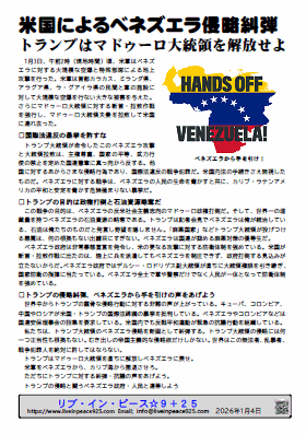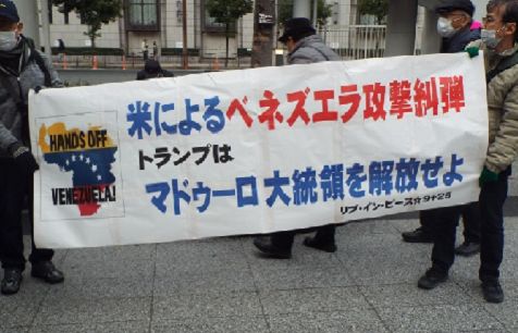 1月3日にトランプ大統領がベネズエラを空爆し、マドゥーロ大統領夫妻を拉致したのを受けて、私たちリブ・イン・ピースは4日、午後3時からトランプ糾弾とマドゥーロ解放を求めるスタンディングを大阪駅前南東バスターミナルで行なうことを決め、できるだけ広い人々に呼びかけました。 4日のスタンディングには130名以上の市民が集まりました。予想をはるかに上回る人たちが駆けつけてくれました。ガザ連帯運動を闘う人たちもたくさん駆け付けてくれました。 呼びかけのリブ・イン・ピースや協力してベネズエラ連帯運動をしてきたキューバを知る大阪の会のメンバー、阪大の大学院生、アルジェリアから来た女性、京都でベネズエラ連帯運動をしている研究者、労働組合で闘っている方、市民運動の取り組む方などさまざまな人がスピーチに立ちました。 国際法、国連憲章の根幹をなす、主権の尊重と平等、武力行使の禁止を公然と踏みにじったトランプに強い怒りの声が寄せられました。口々に石油を手に入れるための攻撃を糾弾し、植民地主義やモンロー主義を批判しました。そしてベネズエラの闘う人々と連帯し、マドゥーロを解放するまで闘おうと訴えました。 発言の合間に、「不屈の民」をみんなで合唱し、歌声は駅前の人場に響き渡りました。バスターミナルで通行人も多かったですが、通っていくときに賛同の身振りをして答えてくれる人もたくさんいました。 最後に、米国のベネズエラ侵略糾弾、マドゥーロ大統領を直ちに解放せよ、米軍はベネズエラ・カリブ海から撤退せよ、ベネズエラ政府・人民と連帯しよう、世界中の運動と連帯して米の侵略を止めようなどを確認してスタンディングを終えました。 2026年1月5日 ![]() ![]() |