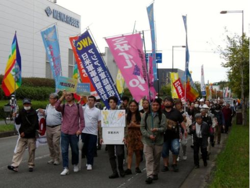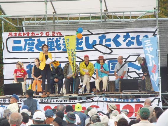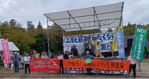 ![]() 10月19日、京都府南部のけいはんな記念公園芝生広場で「私たちは二度と戦争をしたくない!平和でこそ文化は香り立つ!祝園全国集会」が開催されました。同公園は、大増設工事に着手されている祝園ミサイル弾薬庫(祝園分屯地)に近接する公園で、京都、奈良、大阪、兵庫の関西周辺地区と米軍・自衛隊基地を抱える全国各地から2700人が結集しました。前日には、全国交流集会も開催されました。 午前11時から始まった第一部は「Peace Piece フェス」。いろんな人が平和のカケラを持ち寄って、パズルのように平和を作り上げたいという趣旨で、踊りやラップ、ロックやピアノ弾き語りと多彩な音楽ステージがにぎやかに行われました。午後1時からは「祝園・全国リレートーク」。前半は各地からのアピール、後半は「関西チーム」からのアピールが行われました。 前半の各地からのアピールは、今年2月に、日本列島を再び戦争にしないための闘争のつながりである「戦争止めよう沖縄・西日本ネットワーク(沖西ネット)」が結成されており、そこに名を連ねる諸団体からのものでした。保守大国で何とか国の暴走を止めるために闘う(熊本)、対中戦争の最前線にさせてはならない(石垣島)、大分第6師団が南京大虐殺にかかわった、再び対中戦争を許してはならない(大分)、トマホークが持ち込まれたら危険性が桁違いになる(広島・呉・岩国)、神戸方式を守らせてきた闘いを引き継ぐ(神戸)、三菱重工があり、基地反対と軍需産業反対は一体(愛知)、東富士演習場での長射程ミサイル発射訓練など軍事演習の危険が増大している(静岡)、米軍だけでなく自衛隊による被害も問題に(神奈川)など、各地での取り組みの課題とその強化がアピールされました。 後半の関西チームからのアピールでは、祝園は文化財の宝庫である奈良に隣接し、国立国会図書館などがある学術都市であり、豊かに自然と農業があり、暮らしやすい街だ、そのような地域に住民の声を無視して強行することは許されないとの発言が次々にありました。饗庭野演習場で実弾が基地外に発射された事件があり今回の自衛隊統合演習では使わせなかったこと、Xバンドレーダー基地では米日が勝手に訓練をし、敷地外を銃を持って移動した件、舞鶴のイージス艦にトマホークが装備されようとしていること、祝園のミサイルが住宅地を通って舞鶴の基地に運ばれる危険性、なによりも有事になれば真っ先に攻撃対象になってしまう危険性が指摘されました。祝園現地や周辺からは、スタンディングやのぼりを立てたり粘り強く危険性を訴え、反対運動を広げていること、弾薬庫周辺の地域で弾薬庫反対の署名を粘り強く集めていることが報告されました。また京都と奈良では比較的弾薬庫増設の問題は知られているが、大阪ではほとんどメディアで報道されることがないが、頑張って広げていきたいとの発言もありました。最終トークでは、沖縄戦遺骨収集ボランティア「ガマフヤー」の具志堅隆松さんから、「沖縄では戦後処理が終わっていない、遺骨が出てくる、にもかかわらず「台湾有事があおられ、再び戦争に向かおうとしている、ノーモア沖縄戦、今度戦場になるのは沖縄だけではない」と発言がありました。 緊急の提案として、石破首相と中谷防衛大臣あてに、10月20日から行われる予定の大規模な「自衛隊統合演習」の中止を求める申し入れが確認されました。これは前回よりも21500人多い52300人の自衛隊員が参加し、5900人の米軍も参加する大規模なものです。「レゾリュート・ドラゴン25」はじめきわめて実戦的で、挑発的で、危険な軍事演習が今年に入って連続して行われています。最後に、祝園弾薬庫の増設工事強行に反対し、全国での戦争基地化に反対する「集会宣言」を参加者一同で確認しました。 ピースパレードは、約一時間かけて公園のまわりの1.7キロを一周しました。パレードのコールに呼応してクラクションを鳴らす車や、家の窓から手を振るお年寄りなどが少なからずありました。大学や図書館、奈良の歴史遺産、田んぼや畑が、文字通り弾薬庫に隣接しています。のどかな地域が日本のめる戦争準備の最前線に立たされていることを改めて実感するものでした。リブ・イン・ピース☆9+25も、「中国との戦争のための軍事演習反対」「武器よりゴハン」「ミサイルよりコメ」「日中友好」などの横幕、プラカードを掲げて参加しました。 全国各地で弾薬庫増設や長射程ミサイル配備、基地強化や共同軍事演習に対して反対運動をしている人々が集まり、近畿では祝園の弾薬庫増設反対運動と手をつなぎそれを支えるたくさんの人々が集まり、互いの現状を報告し、励ましあって闘い続けようという気持ちが全面に出た、元気をもらった集会でした。 2025年10月22日 リブ・イン・ピース☆9+25 |